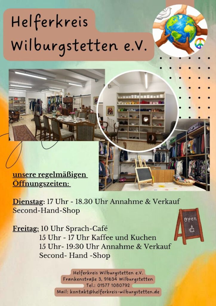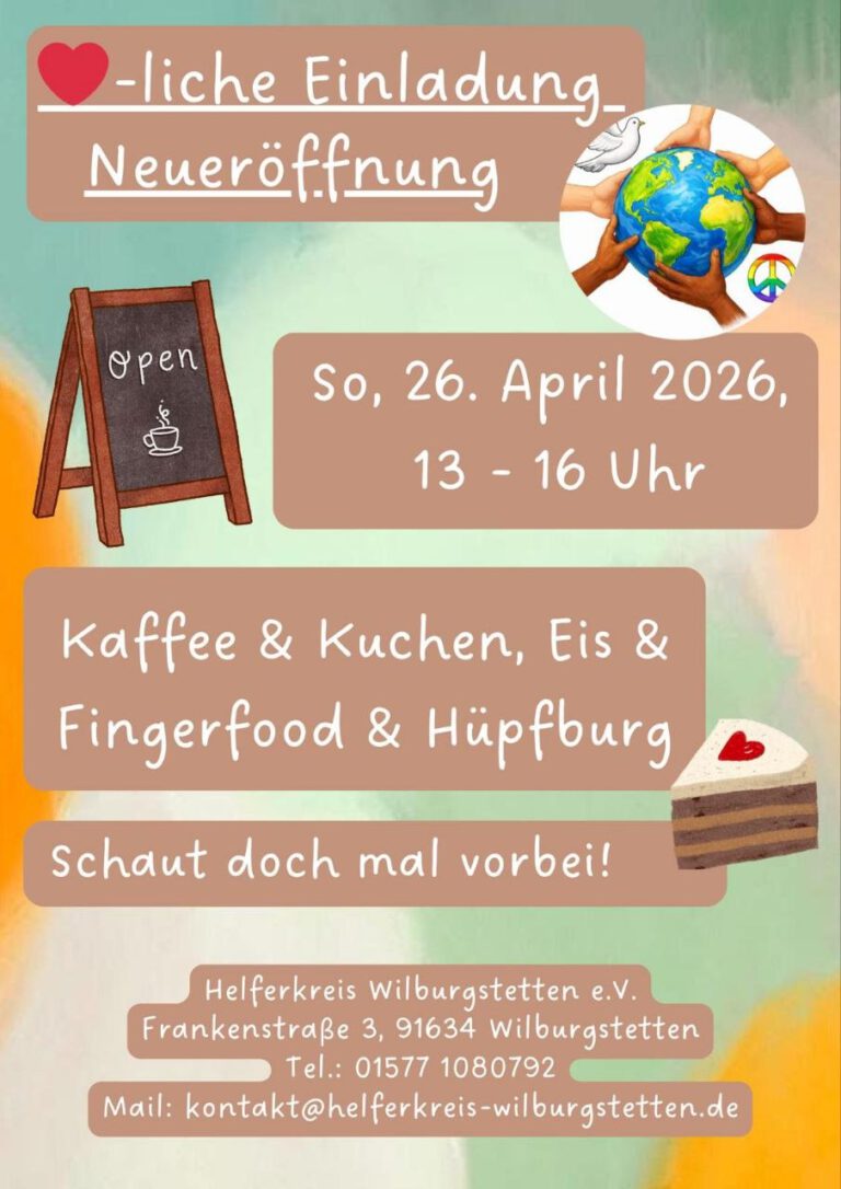 Ihr findet uns ab sofort in der Frankenstr. 3 Eingang bei DHL Post 91634 Wilburgstetten Unsere vorläufigen Öffnungszeiten sind Dienstag 17 – 19 Uhr Scondhand und Begegnung Freitag 15 – 19 Uhr Kaffee, Kuchen, Begegnung und Scondhand Herzliche Einladung zu unserer Eröffung in unseren neuen Räumen Sonntag 26.04.26 13 – […]